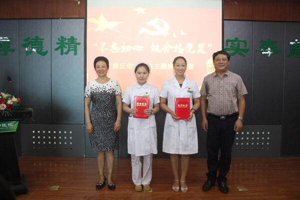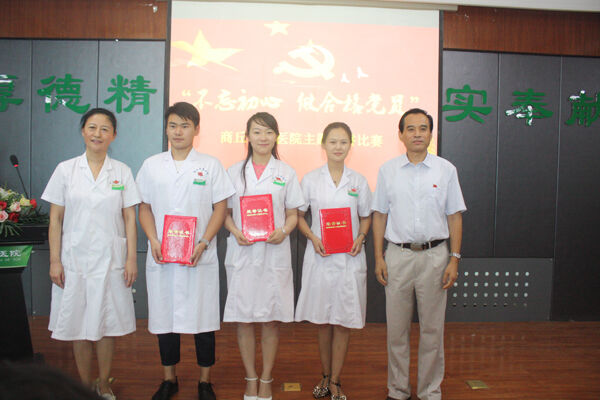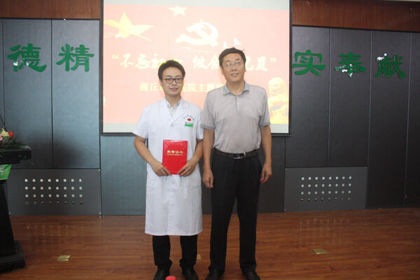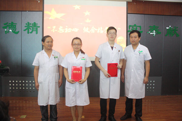 (外科党支部书记陈忠明(左一)、内科党支部书记张众(右一)为优秀奖获得者颁奖)