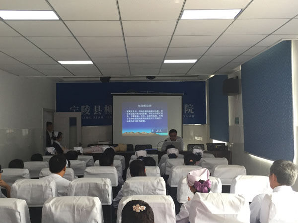 义诊当日,ICU黄海宁医师还为卫生院医护人员做了急救知识培训,为大家讲述心肺复苏操作流程、海姆立克急救法,卫生院50余名医护人员到场听课。