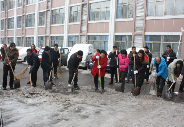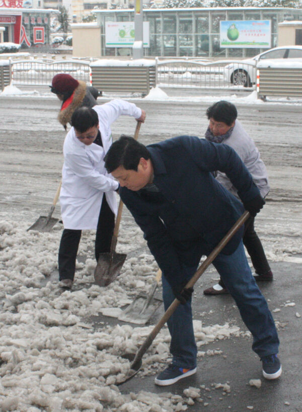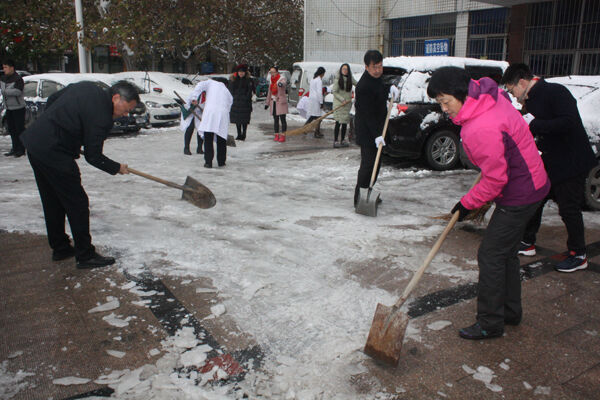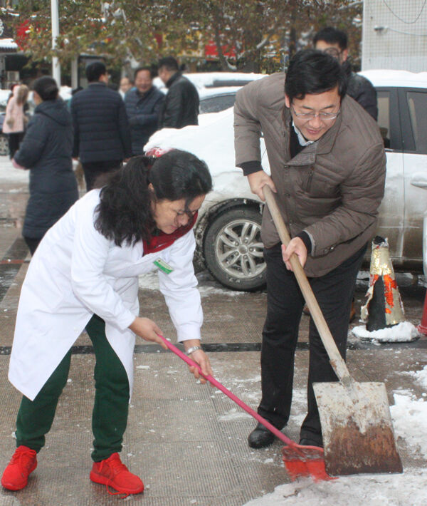 院长朱伯健、院党委书记马玉东、副院长张士兰、张柏华、工会主席郭玉峰等院领导身先士卒,挥舞着铁锹、扫把等工具,奋力清扫着积雪,职工们紧跟其后,相互配合、齐心协力,一点点地把积雪和冰层铲起来集中堆放清运。尽管大家的脸都冻得通红,但丝毫没有影响大家的劳动热情。