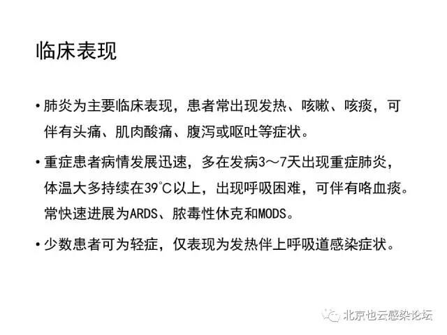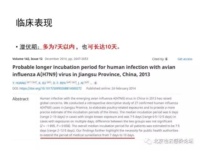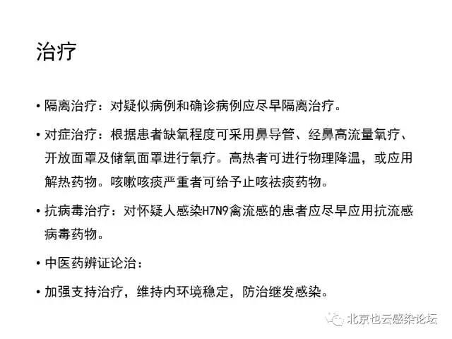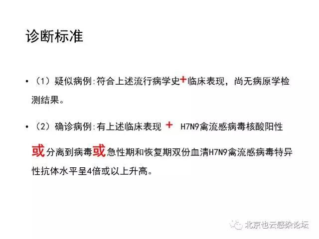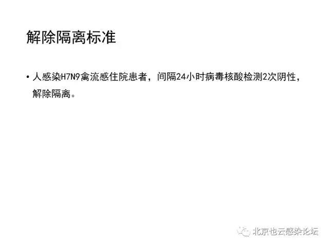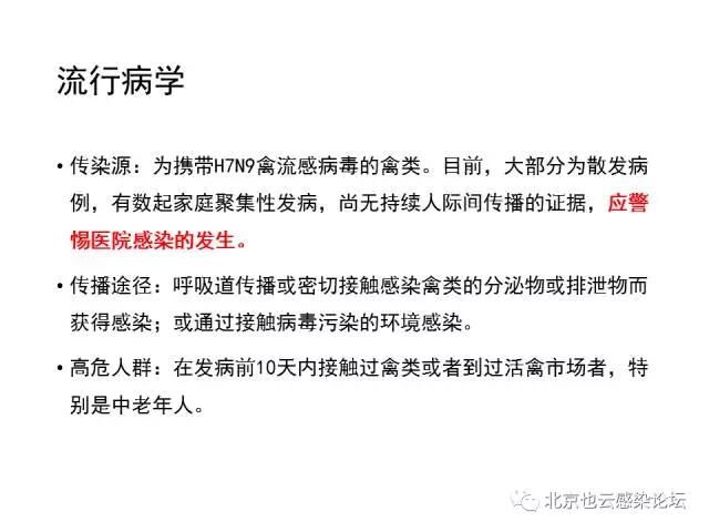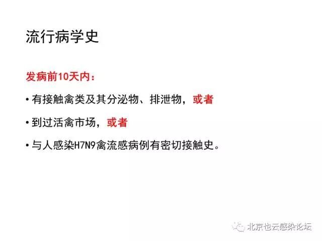 目前报告的病例虽然大部分有活禽或活禽市场暴露史,但有部分病例并无明确暴露史。因此,对发病前10天内有H7N9禽流感疫情地居住或旅行史、出现流感样症状的患者,也要警惕H7N9禽流感可能。