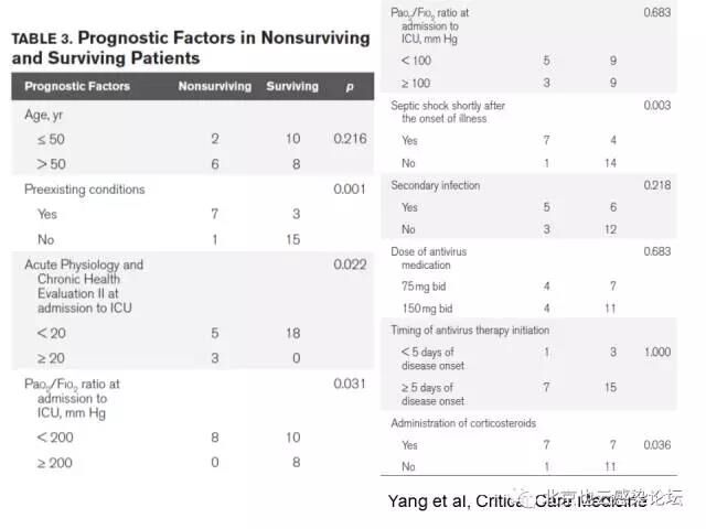 多因素分析显示,基础疾病是进展至中度至重度的ARDS的独立危险因素(OR 3.4,95% CI 1.2-9.7),休克是死亡的**预测因子(OR 6.5, 95% CI 1.1-38.9)。