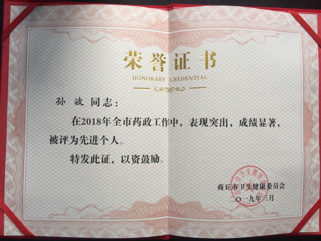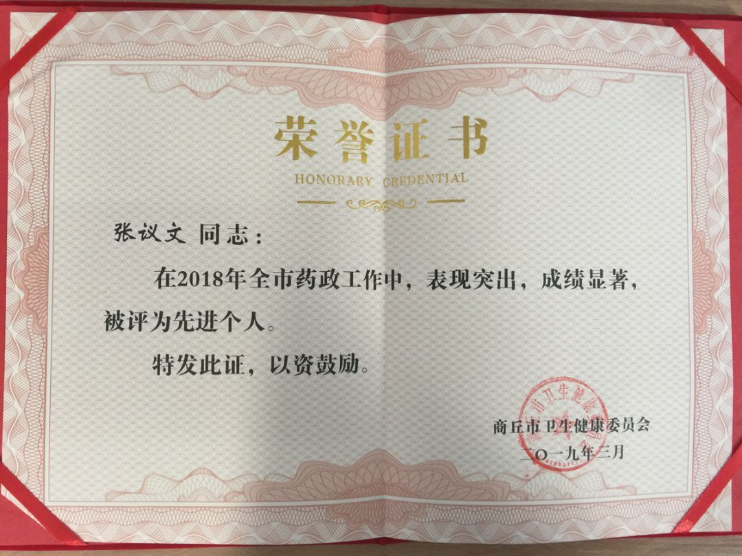 会上,商丘市中医院获得“2018年度全市药政工作先进单位”,副院长张柏华上台领奖。同时张震同志被评为“2018年度河南省药政工作先进个人”;孙波、张议文两名同志获得“2018年度商丘市药政工作先进个人”称号。