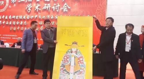 随后伊尹后人(伊奎鑫、伊国伟)向大会捐赠伊尹画像,伊尹文化爱好者(中原皇帝内经聚友会会长沈永强)向大会和嘉宾捐赠华夏五千年医药圣贤图。