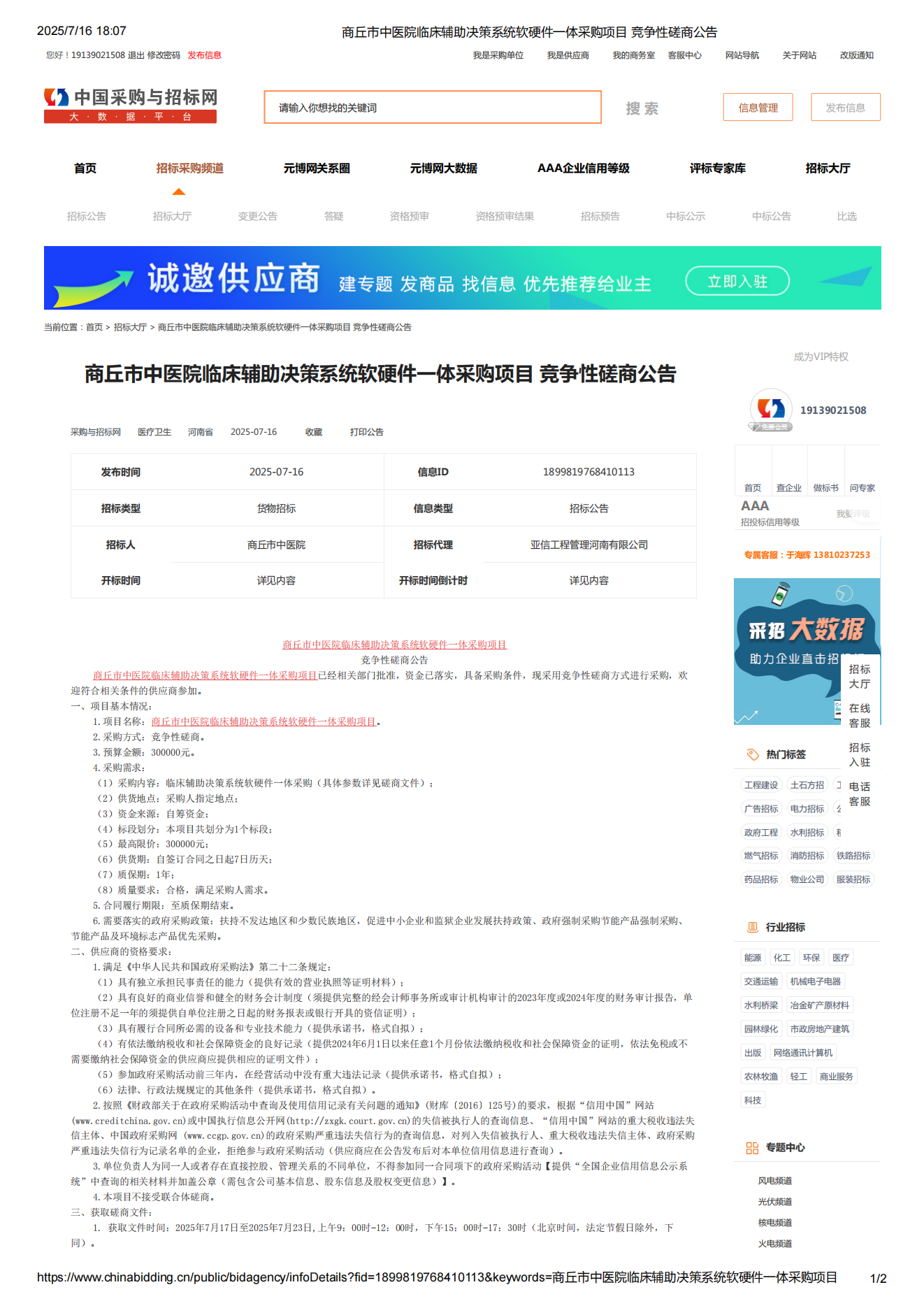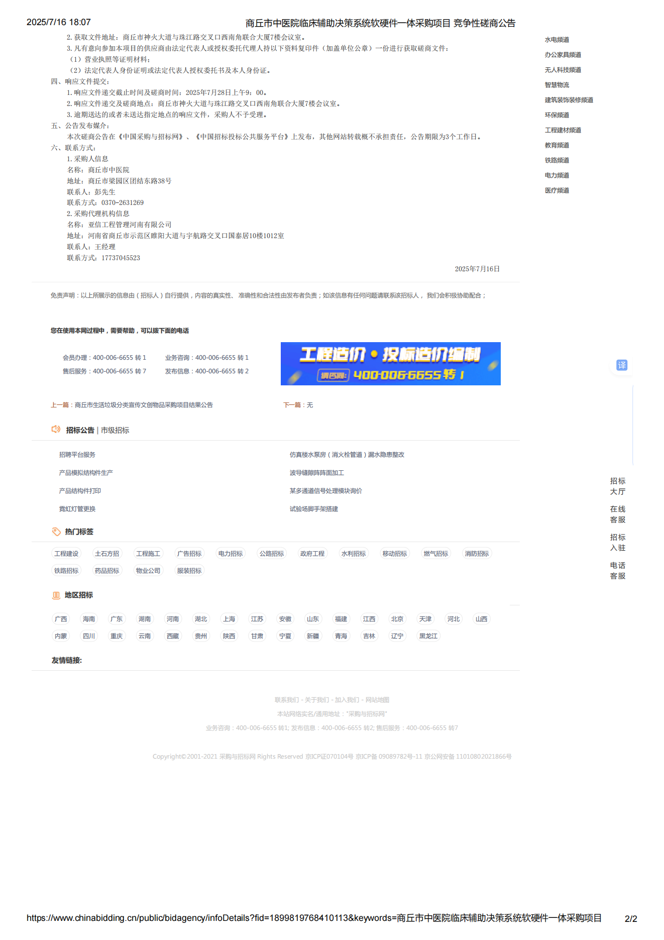 商丘市中医院临床辅助决策系统软硬件一体采购项目 竞争性磋商公告 时间:2025-07-17 17:02:11 浏览量:8723次 商丘市中医院临床辅助决策系统软硬件一体采购项目 竞争性磋商公告.pdf 上一篇:全院统一检查预约管理平台软硬件一体采购项目竞争性磋商公告 下一篇:商丘市中医院运营管理和财政收支情况内部审计服务项目竞争性磋商公告 预约挂号 坐诊时间 门诊流程 住院流程 医保服务 病友之声 来院路线